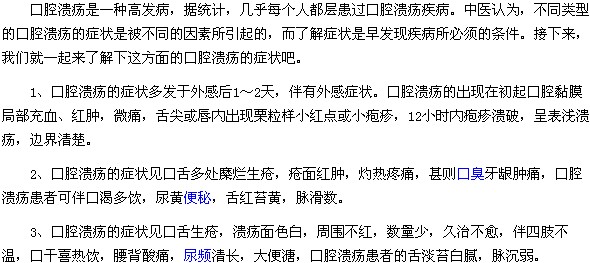 通过以上“中医认为不同因素引起口腔溃疡的症状不同”内容的介绍,相信大家对此已经了解了,希望对大家有所帮助,医学教育网小编祝患有口腔溃疡的朋友们早日恢复健康。