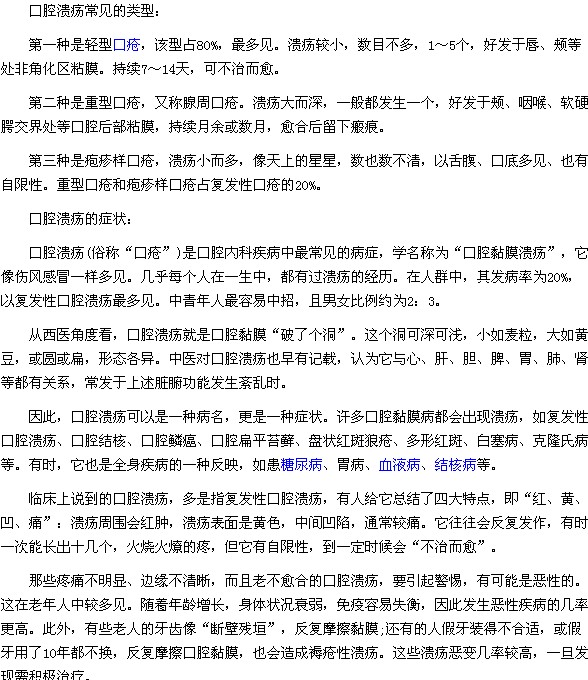 相信很多人都想知道口腔溃疡常见的类型及症状是什么?医学教育网编辑为您搜集整理了口腔溃疡常见的类型及症状是什么的具体内容,供您参考,下面就让小编带大家一起来看看吧。