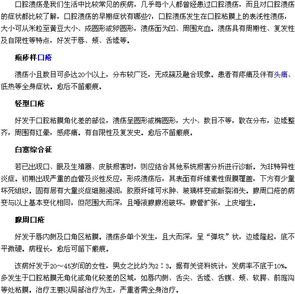 口腔溃疡的早期症状有哪些?相信很多经常患口轻溃疡的人都想知道,医学教育网编辑特为您搜集整理了这篇“口腔溃疡的早期症状有哪些?”的文章,供您参考下面就让小编给大家具体介绍一下吧。
