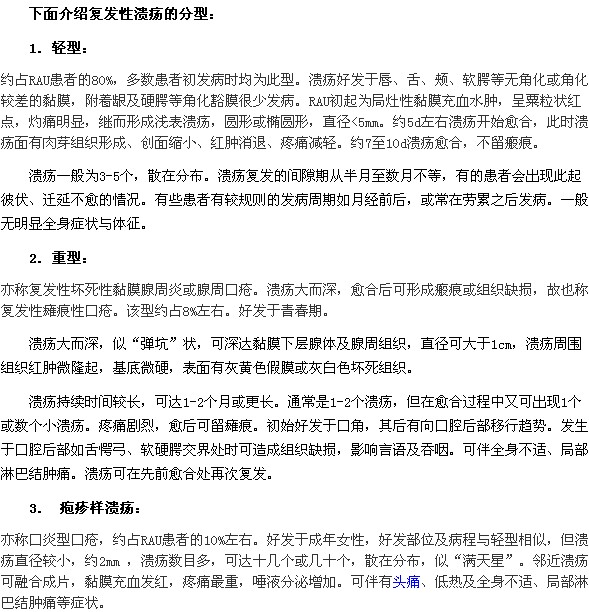 复发性口腔溃疡的有几种分型?相信很多人都想了解,为方便大家查看阅读相关知识,医学教育网小编特整理了以下复发性口腔溃疡的分型的文章,供大家参考。