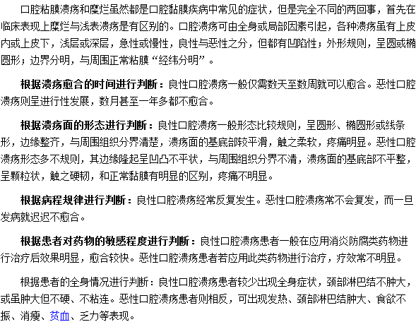 以上就是关于“口腔溃疡的诊断方法及预防措施”内容的介绍,相信大家已经有所了解。口腔溃疡在很大程度上与个人身体素质有关,因此口腔溃疡也被认为是身体变弱的信号,所以患者要加强身体锻炼,改善体质。出现口腔溃疡时,患者若同时感到身体疲乏,就应检查自己平时的营养是否均衡,休息是否足够,并应适量补充各种维生素和矿物质。