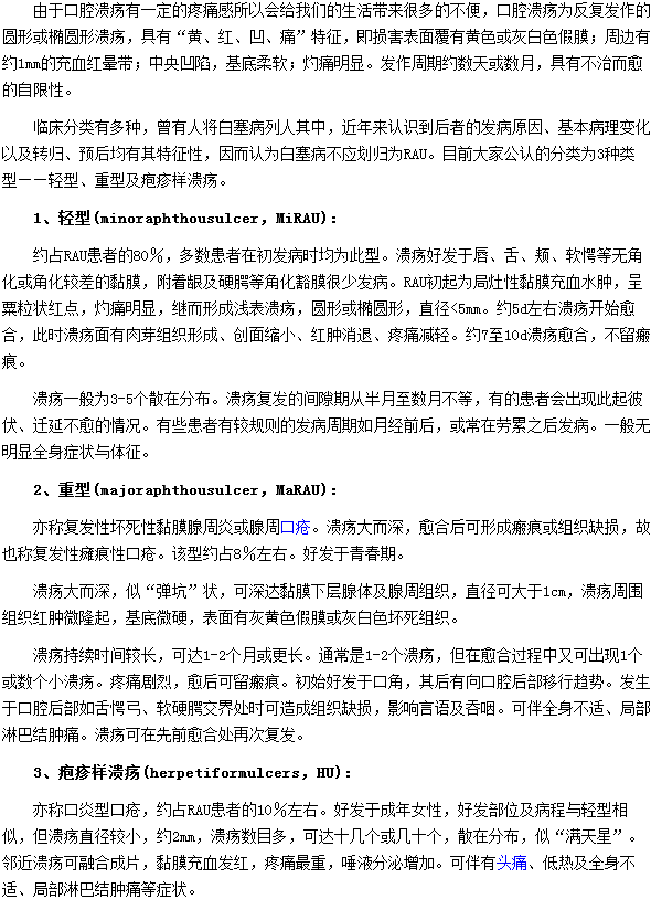 以上患上口腔溃疡会出现哪些典型症状就为大家介绍完了,希望上述文章能够引起大家的重视,如果有相同症状出现需要及时进行正规的治疗,以避免病情加重。