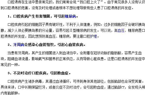 口腔溃疡除本身症状影响外还可能出现哪些并发症,相信大家已经了解。所以,当大家有口腔溃疡的症状表现时,要引起高度的重视,同时也要注意生活中的一些护理。