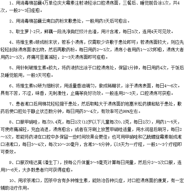 以上口腔溃疡自我治疗的十种小方法的内容就为大家介绍完了,如果有口腔溃疡的症状出现不妨试一试小编为大家介绍的这几种方法,小编也提醒大家,平常要注意生活习惯,保持正常的睡眠,合理饮食,保证胃肠健康等防止口腔溃疡反复发生。