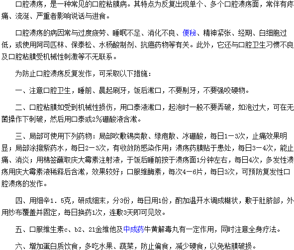 以上就是防止口腔溃疡反复发作应采取的措施的内容,相信大家也已经有了基本的认识,口腔溃疡这种疾病会给患者的生活会带来的很多的不便。所以希望有口腔溃疡的患者及时进行治疗,以免因为拖延导致病情加重,治疗难度也随之越来越大。
