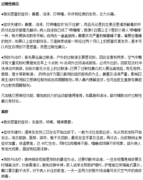 鼻塞、流涕、打喷嚏、咽痛、乏力、高烧时,很多患者立刻启动抗生素及发汗草药的治疗程序;然而,我们被某些疾病初起时的表象所蒙蔽。医生发现某些常见病如过敏性鼻炎、麻疹、乙脑、急性肾炎、产后风湿病等病的早期症状,与感冒相当近似,医学教育网编辑为大家整理一些假冒流感的疾病。