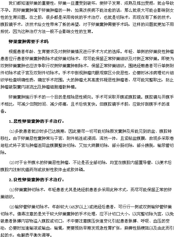 以上“恶性与良性卵巢囊肿的手术治疗方法”的内容相信大家已经有所了解,小编在此提醒大家卵巢囊肿需不需要手术要是自身情况而定,不要盲目选择治疗方法。