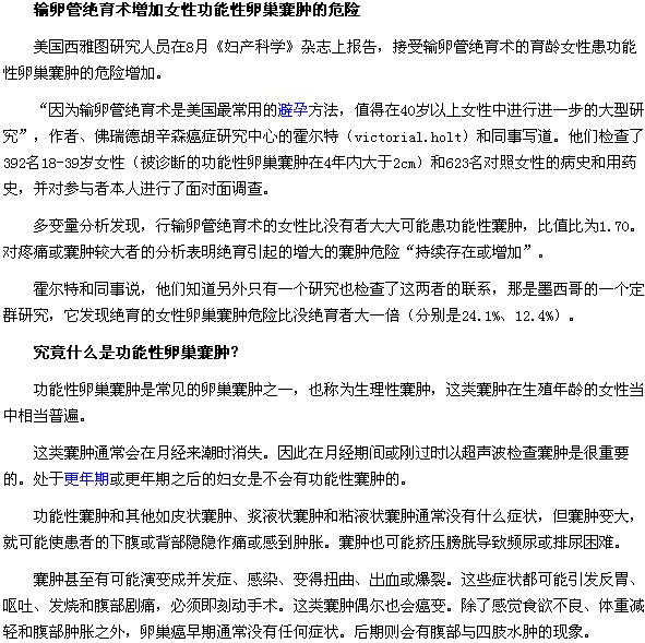 以上“输卵管绝育术会增加卵巢囊肿的危险”的内容,相信广大女性朋友都了解了,希望通过上述文章的阅读,能引起女性朋友们的注意,及早发现及早治疗,以免延误病情。