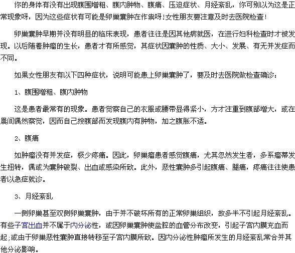 女性朋友有这四种症状说明可能患上了卵巢囊肿,卵巢囊肿一直是女性朋友非常关注的,那么女性朋友出现哪四种症状说明可能患上了卵巢囊肿呢?下面医学教育网小编就为大家介绍如下: