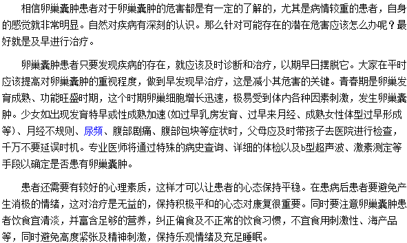 相信很多人会对针对卵巢囊肿的潜在危害应该怎么办的问题比较想俩件,为此,医学教育网编辑特地为您准备了这篇关于针对卵巢囊肿的潜在危害应该怎么办的文章,希望对您有帮助。