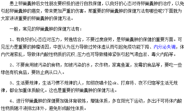 卵巢囊肿是一种常见的妇科病,以20岁至50岁的女性为主要发病群体。卵巢囊肿的生存率一直很低,那么常见的卵巢囊肿的保健方法有哪些呢?下面医学教育网小编就为大家详细介绍如下: