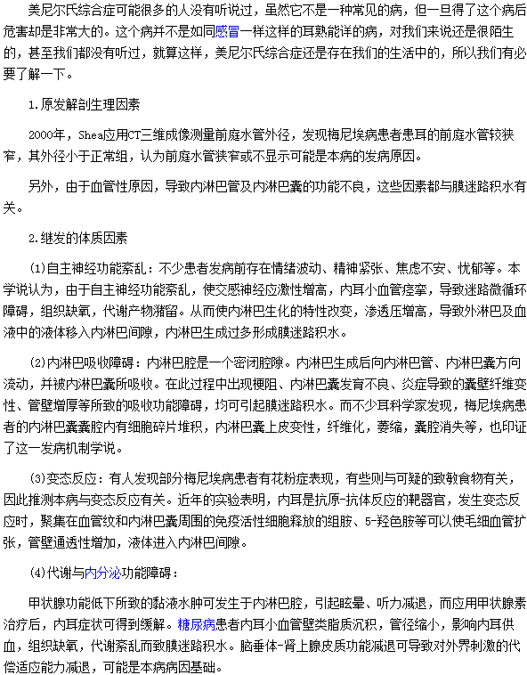 美尼尔氏综合症出现的发病机制是什么?相信很多人都想知道,医学教育网编辑为您搜集整理了美尼尔氏综合症出现的发病机制的具体内容,供您参考。