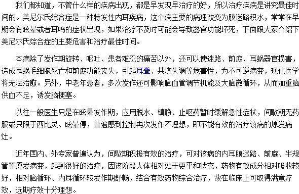 以上就是“美尼尔氏综合症的主要危害和治疗最佳时间”的相关内容,相信大家已经有了基本的认识,在医学上对于疾病的治疗最佳时间主要是采取早发现早治疗的原则,而美尼尔氏综合症属于例外,希望大家在进行此病的治疗时一定要注意选择好治疗的时间,不要引起疾病的加重。