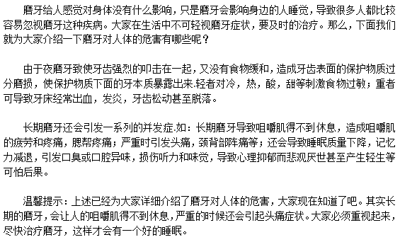 大家都关注很磨牙对人体的危害有哪些吧,医学教育网编辑专门为您整理了磨牙对人体的危害,供您学习和参考。