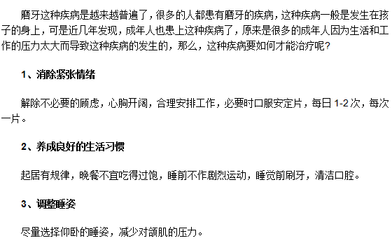 以上文章给我们介绍的就是成年人治疗磨牙的办法了,我们都非常的清楚了,在成年人患有磨牙的时候,我们不妨试试以上介绍的治疗办法进行治疗,提醒大家的是,患有磨牙的患者一定要及时的清理口腔中的细菌,以防发生其他的疾病,祝大家身体早日康复!