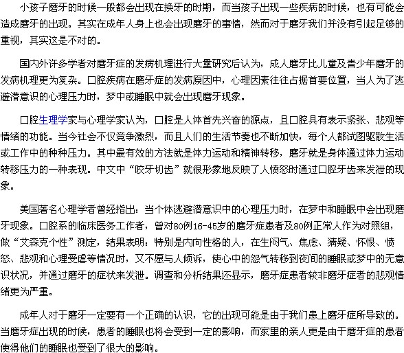 相信经过医学教育网小编的介绍,大家对心理因素在磨牙症的发病原因中占首要位置的内容已经了解了,希望大家都能够重视这种疾病,跟多内容请继续关注医学教育网。