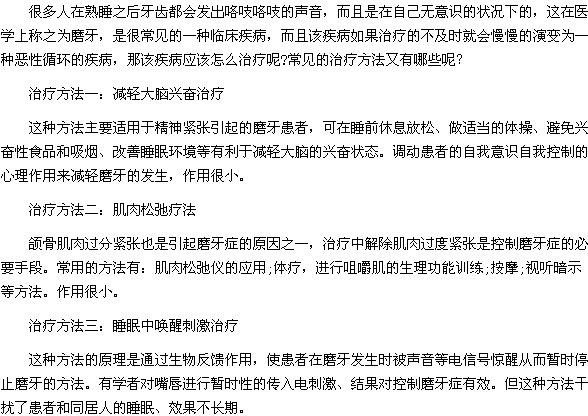 关于常见的治疗磨牙症的方法三则就为大家介绍到这里,磨牙症虽然看起来不会造成什么危害,但是为了身体健康还是有必要检查一下的,很多小宝宝也是该疾病的多发人群,如果小宝宝磨牙很厉害,在一定程度上是会影响孩子发育的,及时治疗是最关键的。