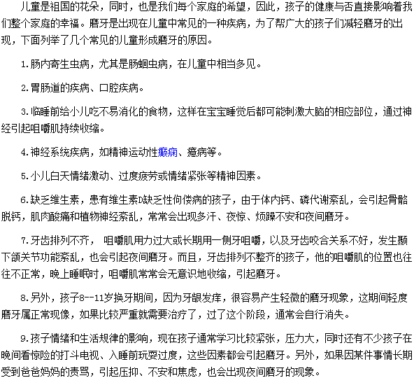 以上所述的常见的儿童磨牙形成的原因仅供参考,医学教育网小编在此也建议广大的家长朋友们在日常生活中多关心一下孩子的饮食起居,帮助孩子们在日常生活中预防磨牙现象,从而帮助孩子健康成长。