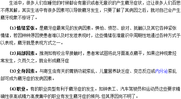 引起磨牙发生的四种因素是什么?这是很多被磨牙困扰的朋友都想知道的问题,为帮助大家了解相关内容,医学教育网小编特将引起磨牙发生的四种因素介绍如下: