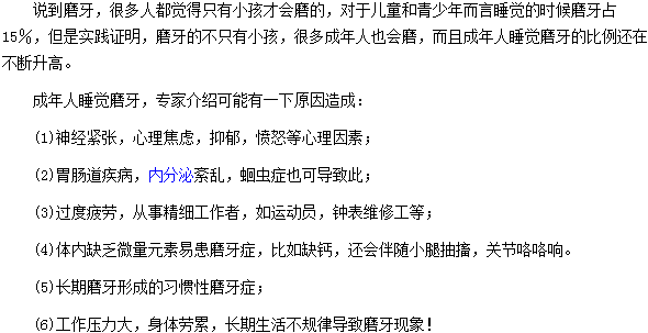 相信很多被磨牙困扰的人,会对成年人睡觉的时候为什么也会磨牙的问题很想了解,下面就请各位考生仔细阅读这篇关于成年人睡觉的时候为什么也会磨牙的文章,希望对大家学习有帮助。