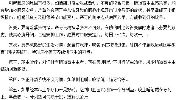 以上就是怎样能够防止晚上睡觉磨牙的一些方法的介绍。磨牙不但和自己的不良生活习惯有关,和自己的情绪也有着很大的关系。因此,在生活中积极参与运动等一些集体生活,让自己的心态健康起来,阳光起来,才能远离磨牙症的困扰。