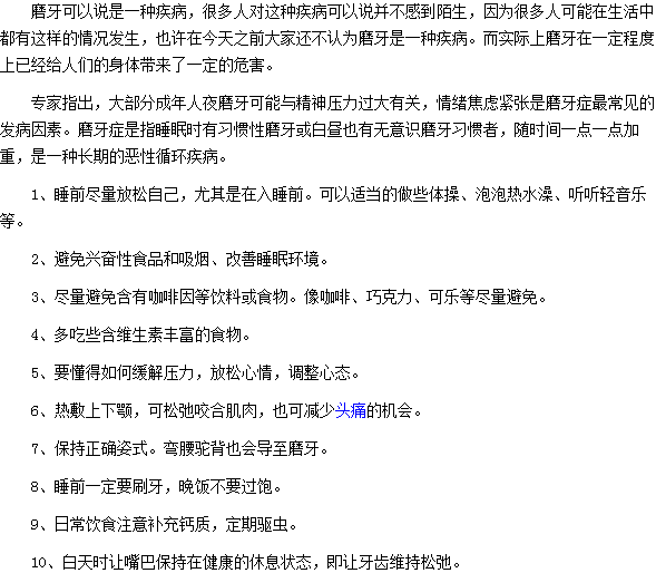 以上是给大家简单的介绍了日常预防磨牙的十种小方法,希望这些方法能够帮助朋友们加深对磨牙的了解。短暂性磨牙可能不会有什么危害,但是如果长期磨牙的话对牙齿带来的危害也是非常严重的。
