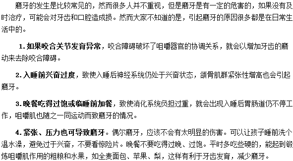 通过我们的介绍相信大家对日常生活中会引起磨牙的原因有了更多的了解,如果患有磨牙症就要立即去医院治疗,不能拖延。治疗时期要有耐心,不能半途而废,不能灰心。