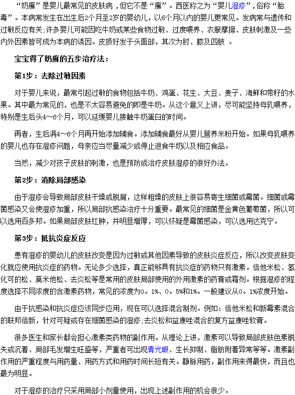 以上就是对“宝宝得了奶癣的五步治疗法”的介绍,希望对宝妈妈们有所帮助。如发现宝宝患了奶癣,不妨试一试小编为大家介绍的这几种方法,希望上述文章能够帮助到大家。
