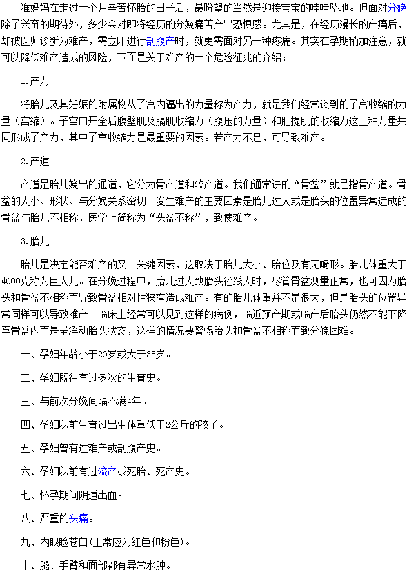 以上就是关于导致孕妇难产的十个危险因素的介绍,相信大家已经了解了,希望对您和家人都能够有所帮助,更多内容请关注医学教育网!本网站所发布的文章并不意味着赞同或证实其观点,仅作为参考信息使用。疾病诊疗或药品选用等专业问题请及时到医院就诊或咨询相关医生。