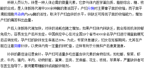以上“锌缺乏可导致孕妇出现难产的情况”的内容就为大家介绍完了,相信大家在看完后已经有所认识了,孕妈妈们在孕期一定要注意合理补充营养,避免出现难产的情况。