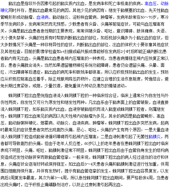 以上就是脑出血、蛛网膜下腔出血时是否会引起头痛的文章,相信大家都有所了解了。想要了解更多关于脑出血的疾病知识请多多关注医学教育网疾病栏目!