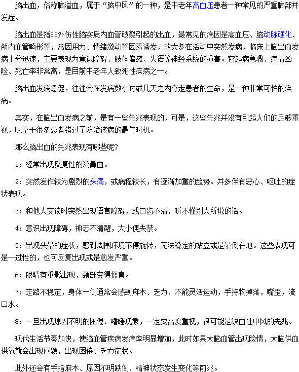 相信很多朋友都很关注出现脑出血的先兆表现有哪些?下面医学教育网小编特为大家整理出现脑出血的先兆表现的相关内容如下: