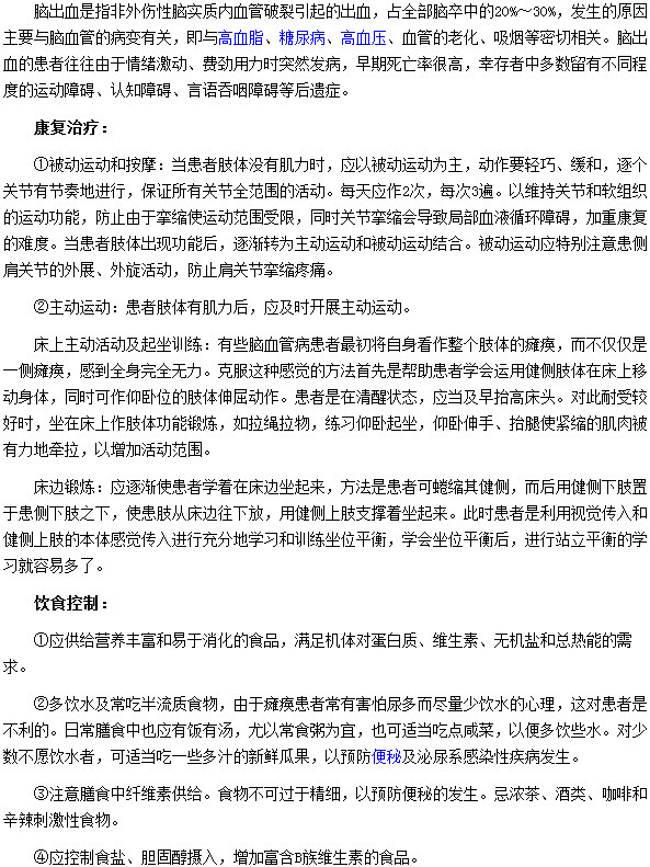 关于脑出血患者的康复治疗及饮食控制的内容,相信很多人都比较感兴趣,医学教育网编辑特撰文如下:
