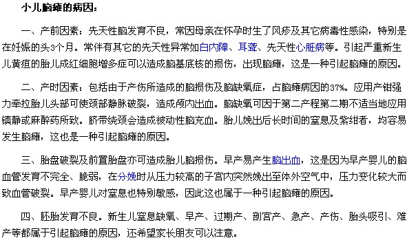 对于小儿脑瘫相信大家通过上述文章的介绍已经有所了解了,小儿脑瘫疾病的频繁发生,让越来越多的妈妈们感觉到不安,该病的病因极为复杂,对于患儿的伤害也较为严重,小儿脑瘫的出现治疗应当及时才行。当小儿脑瘫发生后要及时治疗,要注意护理好患儿,注意他们的卫生,否则会越来越严重,甚至会威胁到患儿的生命。希望大家看完上述文章后,广大脑瘫患儿家长能引起重视。