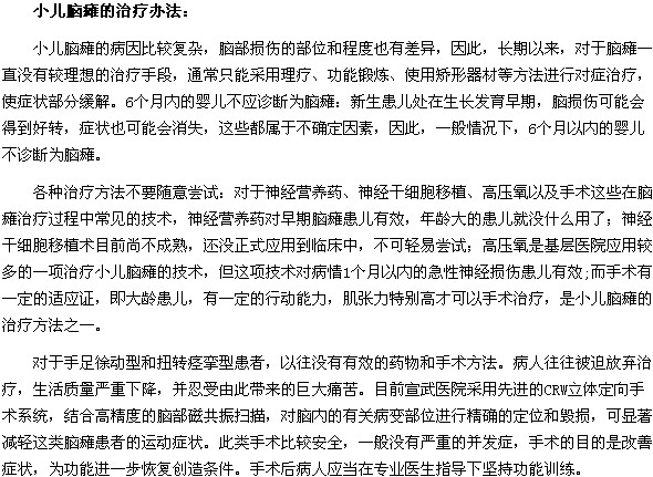 对于小儿脑瘫的治疗方法相信很多患有脑瘫疾病的患儿家长都非常关注,有很多家长朋友们在得知孩子患上脑瘫后,都想尝试各种治疗方法让孩子尽快康复起来,医学教育网小编提醒广大家长朋友们对于小儿脑瘫的各种治疗方法不要随意尝试,具体内容请看一下医学教育网小编给大家整理的文章。