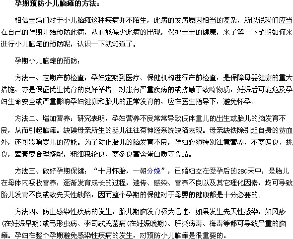 通过对上述文章的介绍,大家对导致小儿脑瘫的病因及孕期预防小儿脑瘫的方法已经有所了解了吧,脑瘫这种疾病带来的危害是十分严重的,大家一定要重视起来,多了解相关知识,做好预期的预防工作,给宝宝一个健康的身体,希望以上内容能够对大家有所帮助。