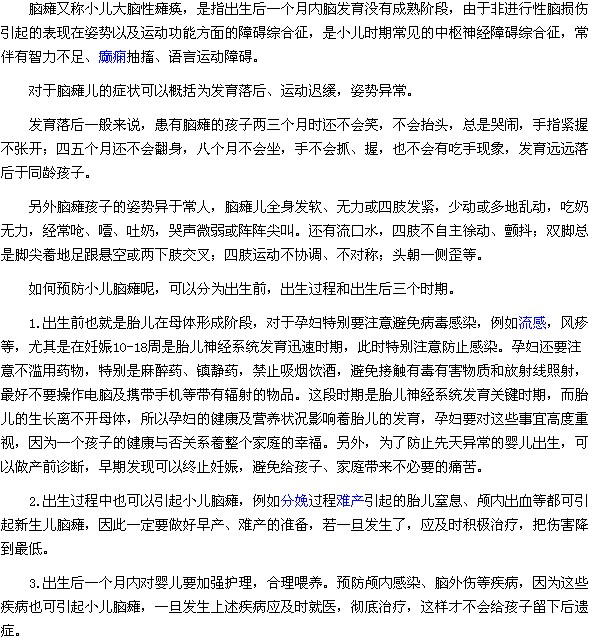小儿脑瘫的症状概况及预防小儿脑瘫的三个时期是什么?关于这个问题相信很多人都很想了解,为此,医学教育网小编特整理了“小儿脑瘫的症状概况及预防小儿脑瘫的三个时期”这篇文章,下面就由小编为大家介绍如下: