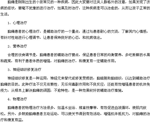 脑瘫的治疗不可盲目,应根据患者的病情,和自身身体状况,制定系统的规范化治疗方案,患者除了要积极配合,临床治疗以外,还应给予相应的辅助治疗措施,综合地进行针对性治疗。以上就是“脑瘫患者的辅助治疗方法”的相关内容,希望对大家有所帮助。