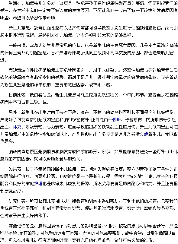 现在脑瘫的发病率越来越高,很多家长朋友对预防和治疗小儿脑瘫的方法也都很关注,但是在了解治疗和预防脑瘫的方法之前,大家要先了解清楚为什么会出现脑瘫,导致脑瘫的原因有哪些,这样才能更好的治疗和预防,下面医学教育网小编特为大家整理了“治疗和预防小儿脑瘫首先要知道会导致脑瘫的原因”这篇文章,供大家参考。