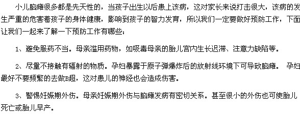 上面就是“预防孩子脑瘫要注意的三个方面”的内容,做为孩子的家长,对于脑瘫这种疾病一定要引起重视,多做一些预防工作,平时多注意孩子孩子的饮食、卫生等各方面。