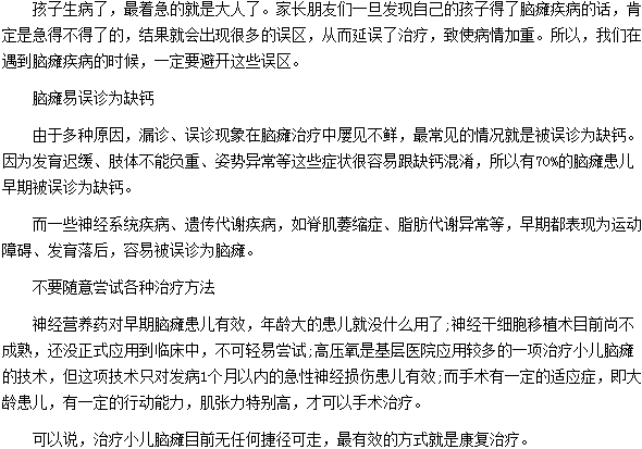 相信很多人对遇到脑瘫疾病的时候要避开的误区的内容都很关注,为帮助大家了解相关内容,医学教育网小编特收集整理了遇到脑瘫疾病的时候要避开的误区的具体内容如下: