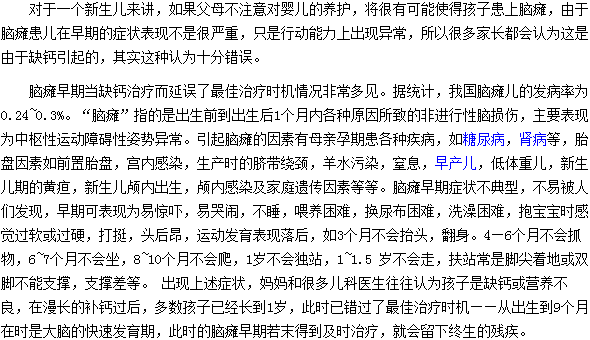 读完孩子脑瘫早期千万不能当缺钙治疗的文章之后,相信妈妈们都能够认清脑瘫的危害了,由于脑瘫患儿在早期根本无法从症状表现上来判定疾病的存在,所以,如果发现孩子有异常表现,必须及时带孩子到医院治疗,希望上述文章能够对大家有所帮助。