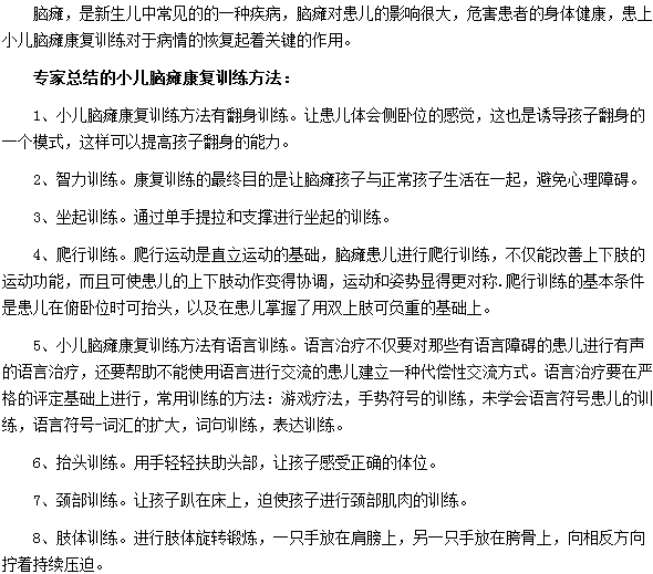 专家总结的小儿脑瘫康复训练方法是什么?相信很多患有脑瘫的患儿家长都很关注,医学教育网小编特为大家整理了专家总结的小儿脑瘫康复训练方法这篇文章,供大家参考阅读。