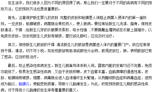 以上就是对于我们应该用什么方法预防小儿脑瘫的介绍,相信大家也有了一定的了解,我们要注意在自己的生活中运用好小儿脑瘫的预防方法。另外,我们还要注意做好对于小儿脑瘫患者治疗以及护理,希望以上的预防方法能够给大家带来帮助。