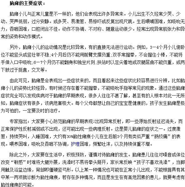 以上介绍的就是小儿脑瘫的主要症状的内容,家长们要更多的了解这些知识,只有这样了家长们才能在生活中更加周到的照顾孩子的健康。