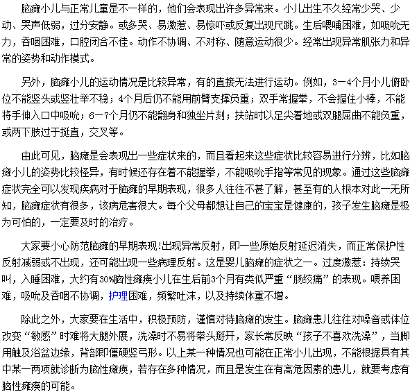 以上介绍的是脑瘫患儿与正常儿童相比有哪些异常,家长们要认真的阅读上面的知识,好好的掌握这些知识,只有这样了家长们才能在生活中更加周到的照顾孩子的健康。