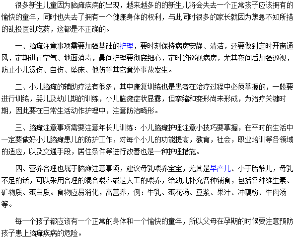 以上就是“小儿患上脑瘫有哪些需要注意的事项”的相关文章,希望家长在了解过后,积极的按照几个方面帮助宝宝恢复健康,希望上述文章能够对大家有所帮助。