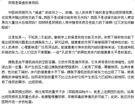 肾虚会尿频吗?尿频是男科常见疾病。正常成人白天排尿4~6次,夜间0~2次,次数明显增多称尿频。导致尿频的原因是很多,也会引起很多疾病,严重影响患者生活,下面看下肾虚会尿频吗?
