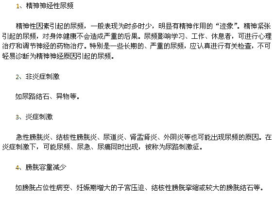 导致女性尿频的原因很多,主要包括膀胱容量减少,如膀胱占位性病变、妊娠期增大的子宫压迫、结核性膀胱挛缩或较大的膀胱结石等,具体原因如下: