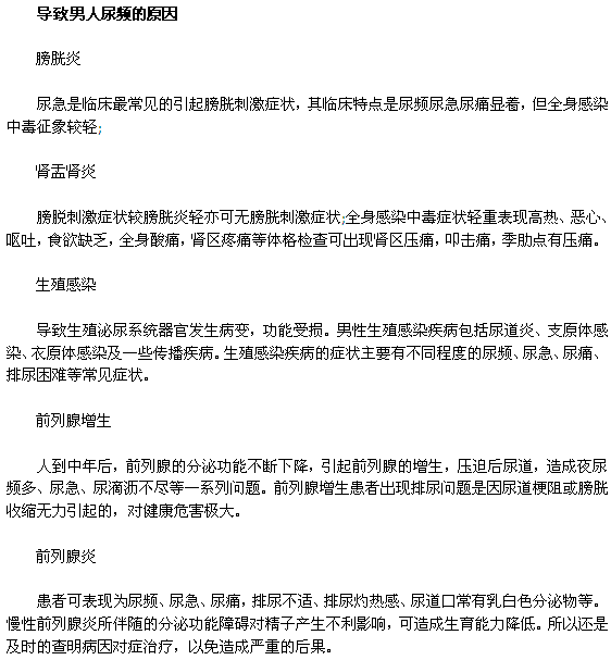 导致男人尿频的原因,尿频属于男科一种最为常见的疾病,多发于老年人,引起尿频的原因很多,前列腺炎、尿路感染等都可能引起男性尿频,严重影响男性健康,下面看下导致男人尿频的原因: